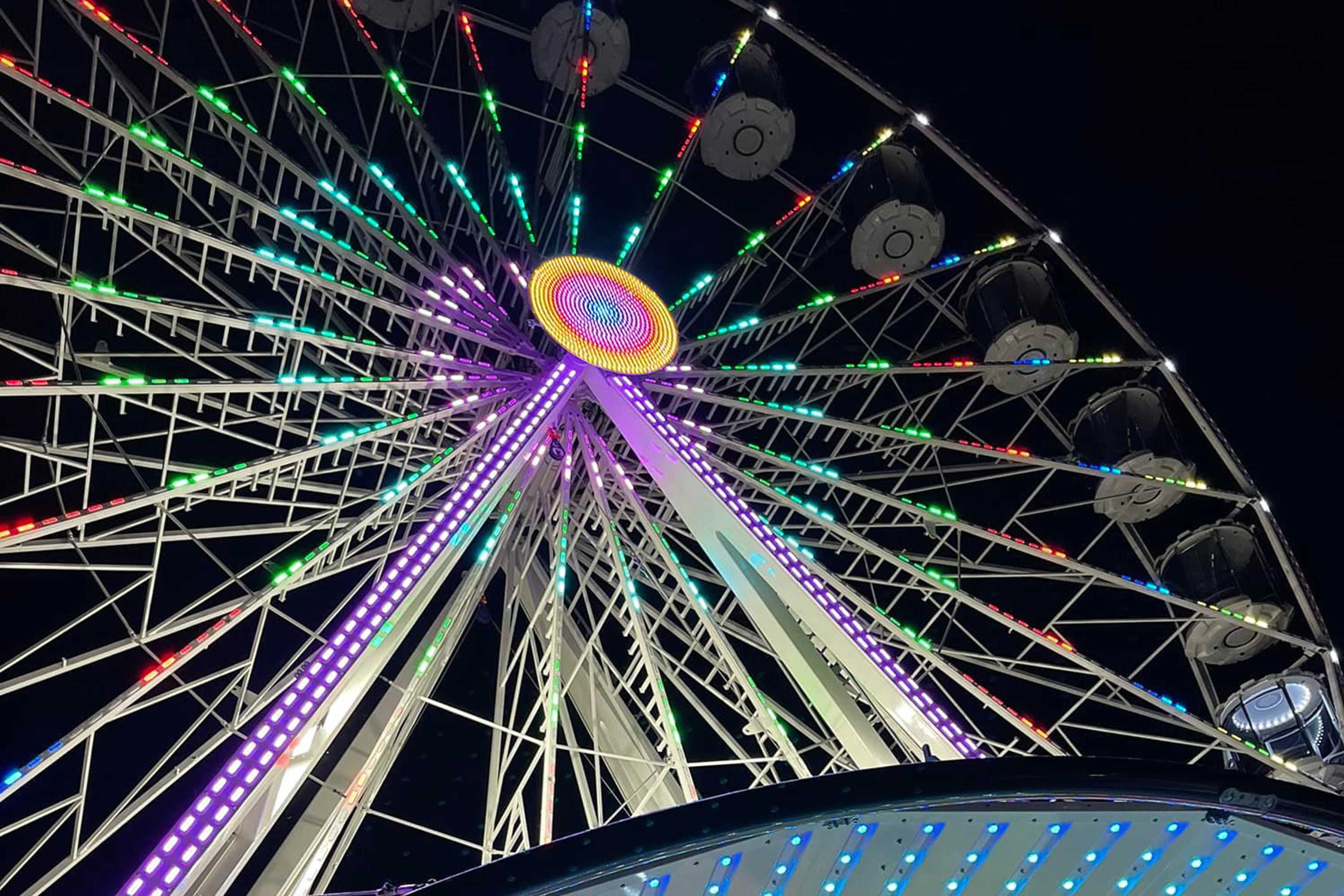 Unser Riesenrad verfügt über eine europaweit einzigartige LED Lightshow. Auf den beidseitig angebrachten LEDs können wir 47 unterschiedliche Farben darstellen und die Licht-Programme computergesteuert selber programmieren und auf jeden Kundenwunsch abstimmen – zum Beispiel auf Firmen- oder Kantonsfarben.